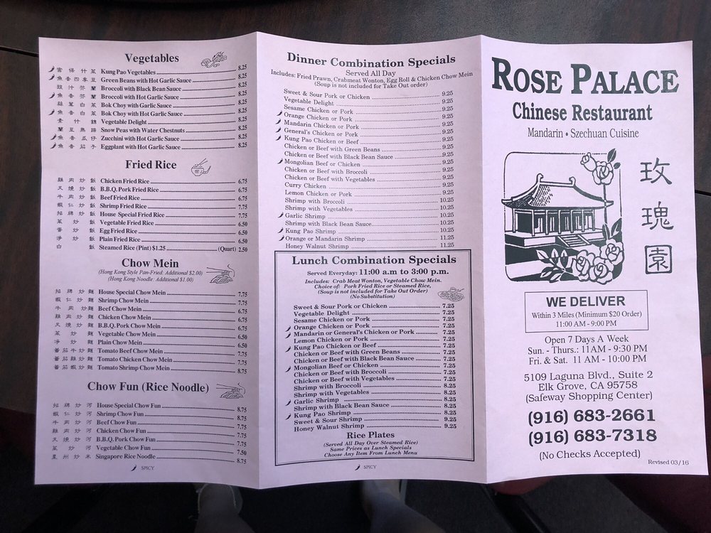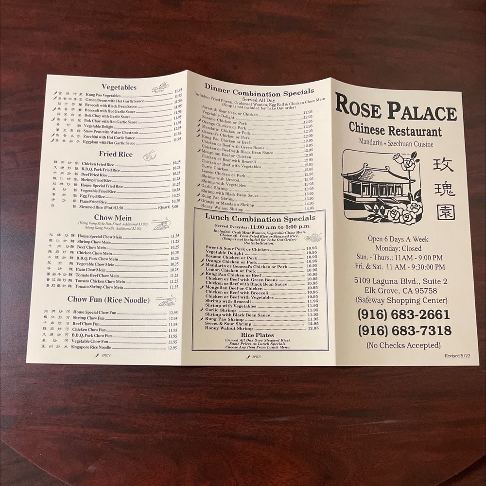 Rose Palace in Elk Grove, CA is a Chinese restaurant that specializes in soup and seafood dishes. Offering delivery, takeout, and catering services, they cater to various dietary preferences with many vegetarian options. With a casual atmosphere and friendly staff, the restaurant is wheelchair accessible and features gender-neutral restrooms. The menu includes appetizers like pot stickers, crabmeat cheese wontons, and salt pepper chicken wings, along with a variety of soups like hot & sour soup and seafood bean curd soup. Customers have praised the quick service and delicious, hot meals. Overall, Rose Palace provides a satisfying dining experience, especially for those looking to enjoy Chinese cuisine in a comfortable setting.